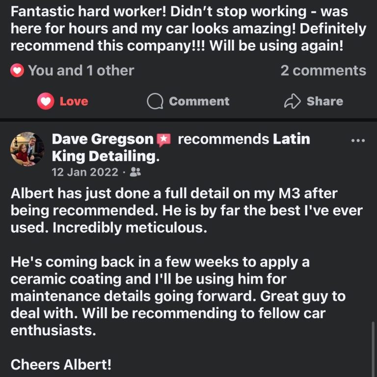 At Latin King Detailing, we pride ourselves on the satisfaction of our clients in Flixton. Read what our satisfied customers have to say about our detailing services. Their testimonials reflect our commitment to providing high-quality results and exceptional customer service in Flixton. We strive to exceed expectations with every wash and detail, ensuring that your vehicle not only looks immaculate but also feels revitalised. Join our community of delighted customers and experience the difference that our dedicated team can make!